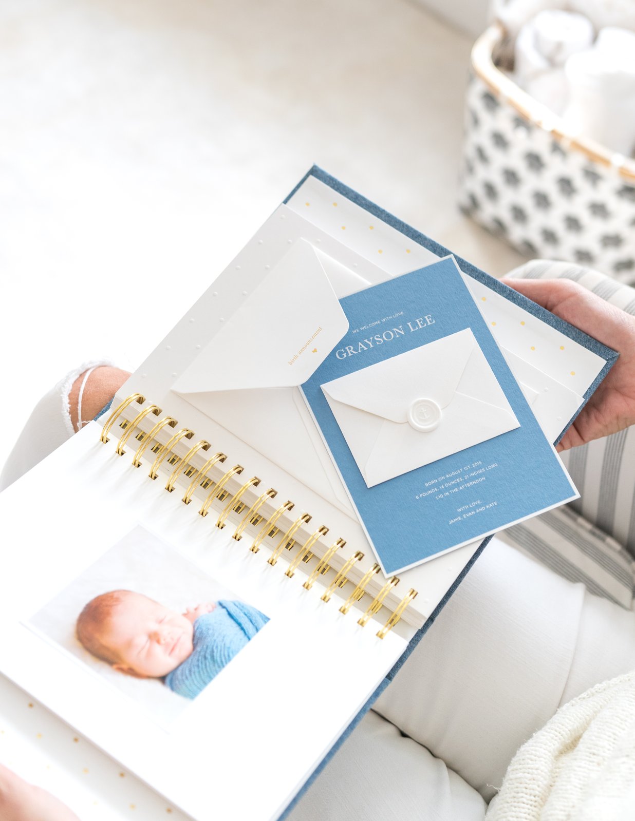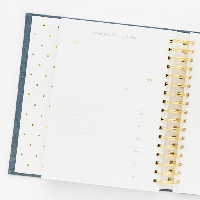 It's the baby book we wish we had when they were born, and can't wait to fill out as they grow. Thoughtful details include envelopes for loose keepsakes, a place for "A letter to my baby", month to month milestones, "The way we told everyone you were coming" and "Things I don't want to forget". Made to fit 4x4 photos, it comes with adhesive to keep each moment in place on extra thick paper with gold foil detail throughout. Packaged in a matching gift box.