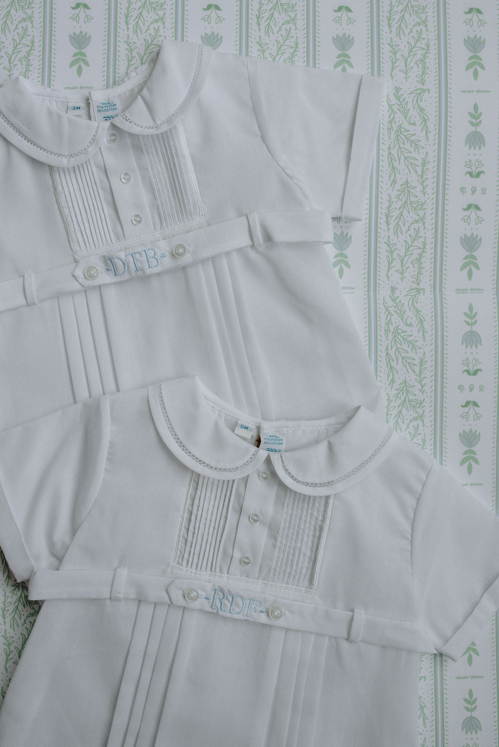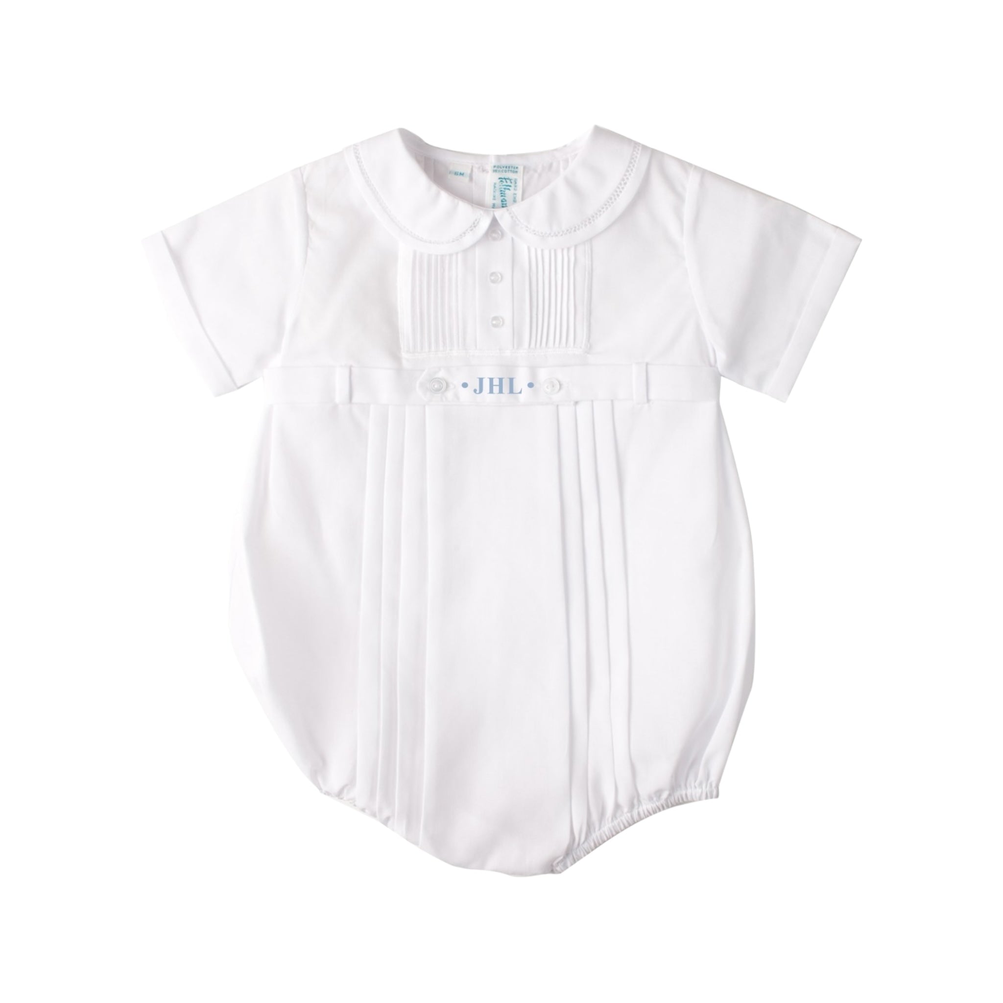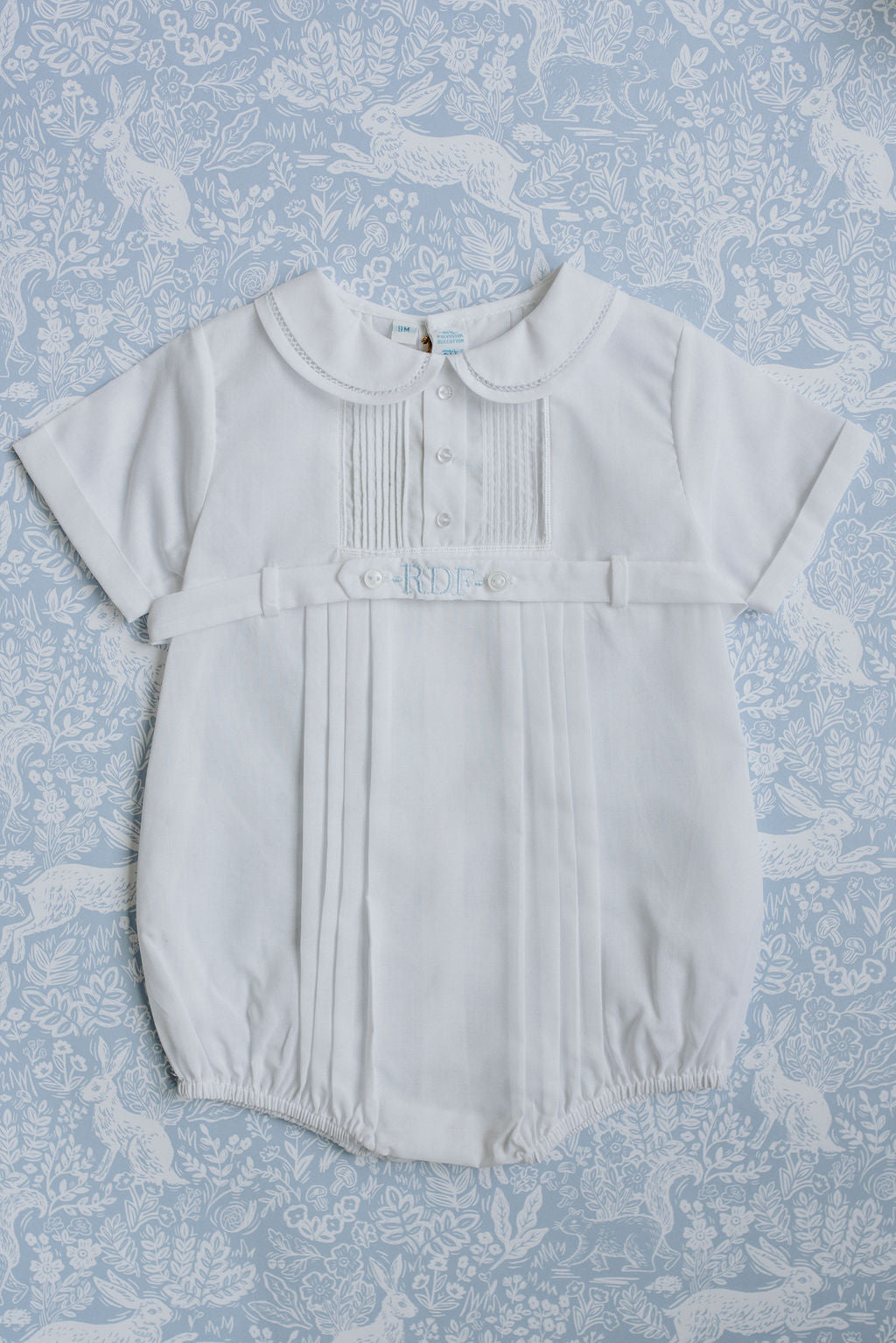 This pure white creeper is classy, sophisticated, and sweet - perfect for your loved one on his big day! This baby boy creeper features a sweet peter pan collar with fagoting trim, and a bodice covered in hand stitched pintucks with dainty little buttons ending in a tiny row of lace beading. A tuxedo style waist band separates the bodice from the sharp pleats beneath it, going down the remainder of the piece. The belt has the option to add your little one's initials to it.