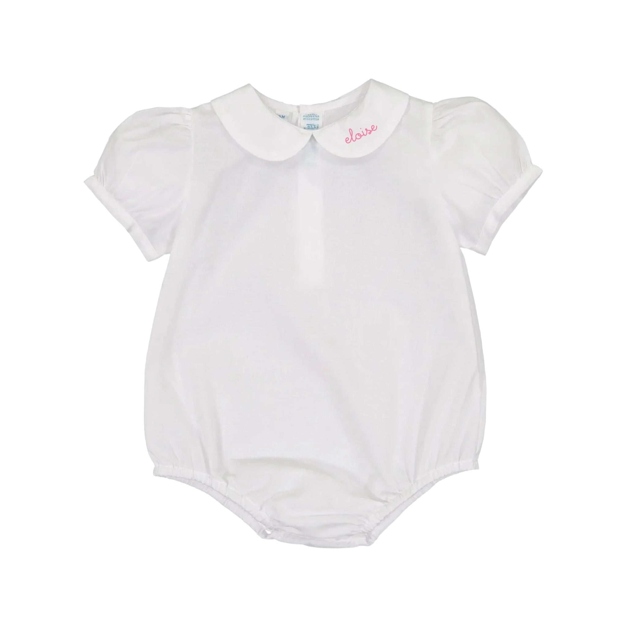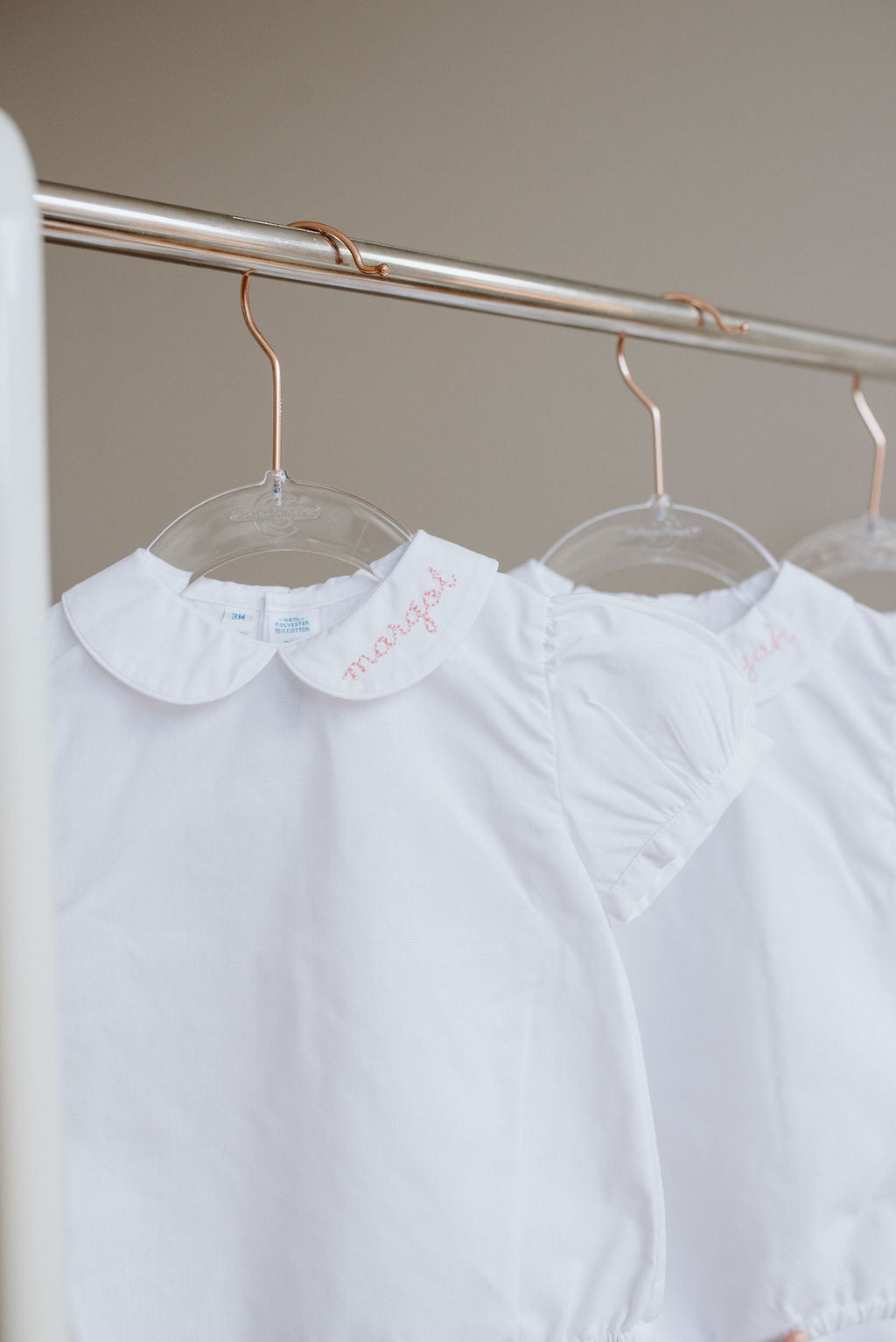 Do you love building an outfit set just the way you like? Do you like layering, matching up tops and bottoms, and making a custom look? Check out this new onesie - a perfect basic piece! Features a vintage-style pointed collar with piping around the edges with your little one’s name or initials on the collar.