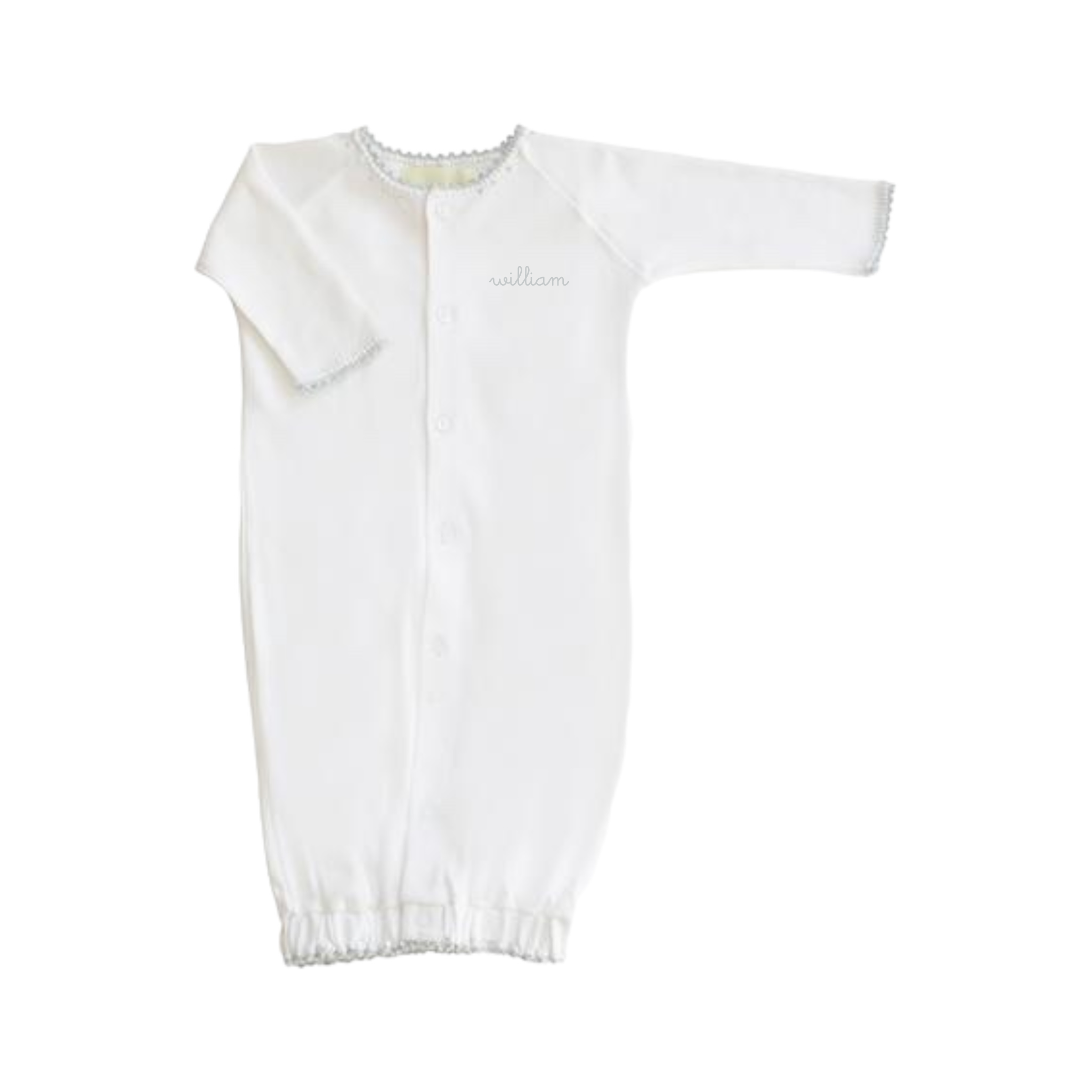 Converts from a gown to a romper with a few snaps. Also available with white trim and blue trim.