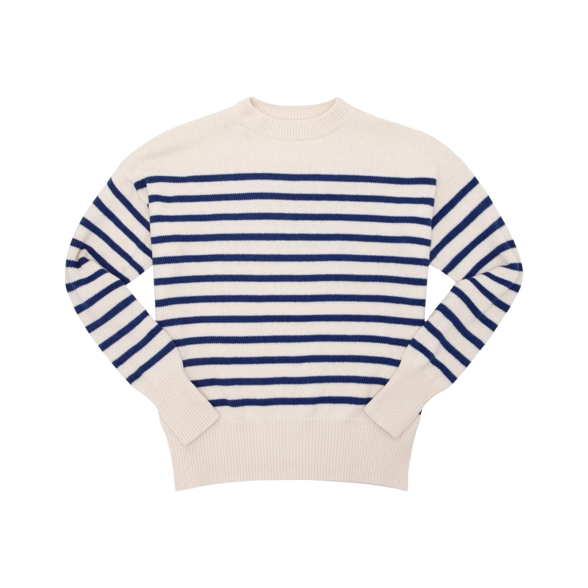 This timeless pullover sweater is ultra-chic and luxuriously soft, perfect for layering or all on its own. it's an effortless addition to any outfit, featuring a relaxed fit, dolman sleeve, and unique ribbed hem. in a classic breton stripe, the cotton-cashmere blend is cozy, breathable, and made to last.