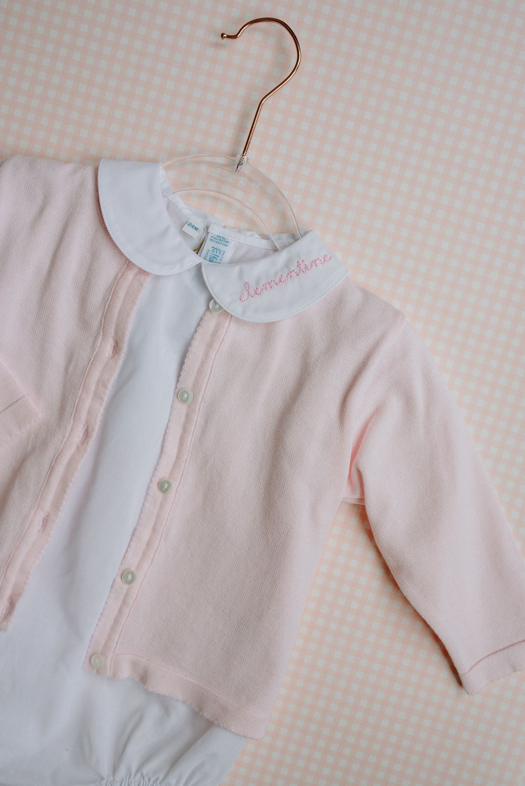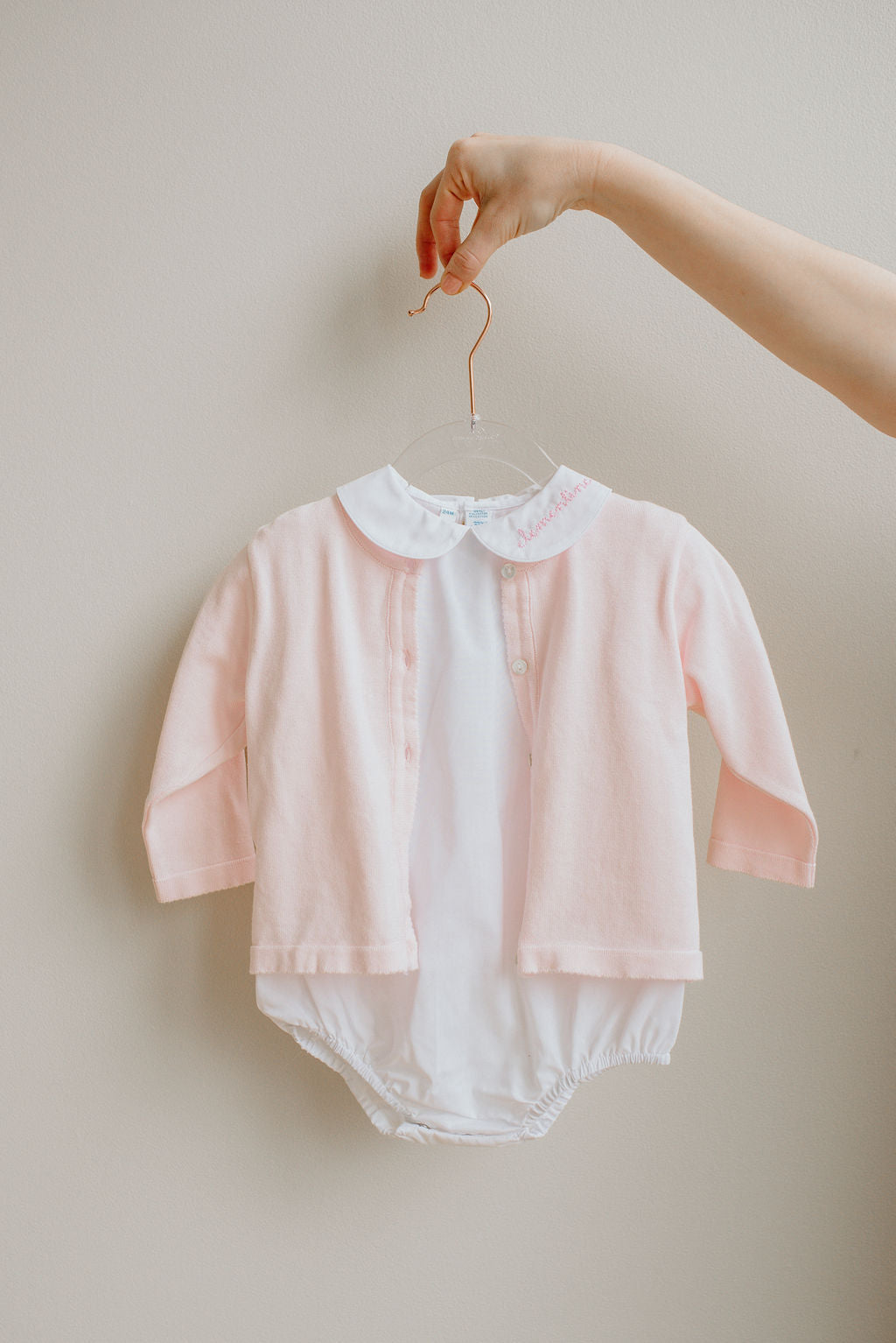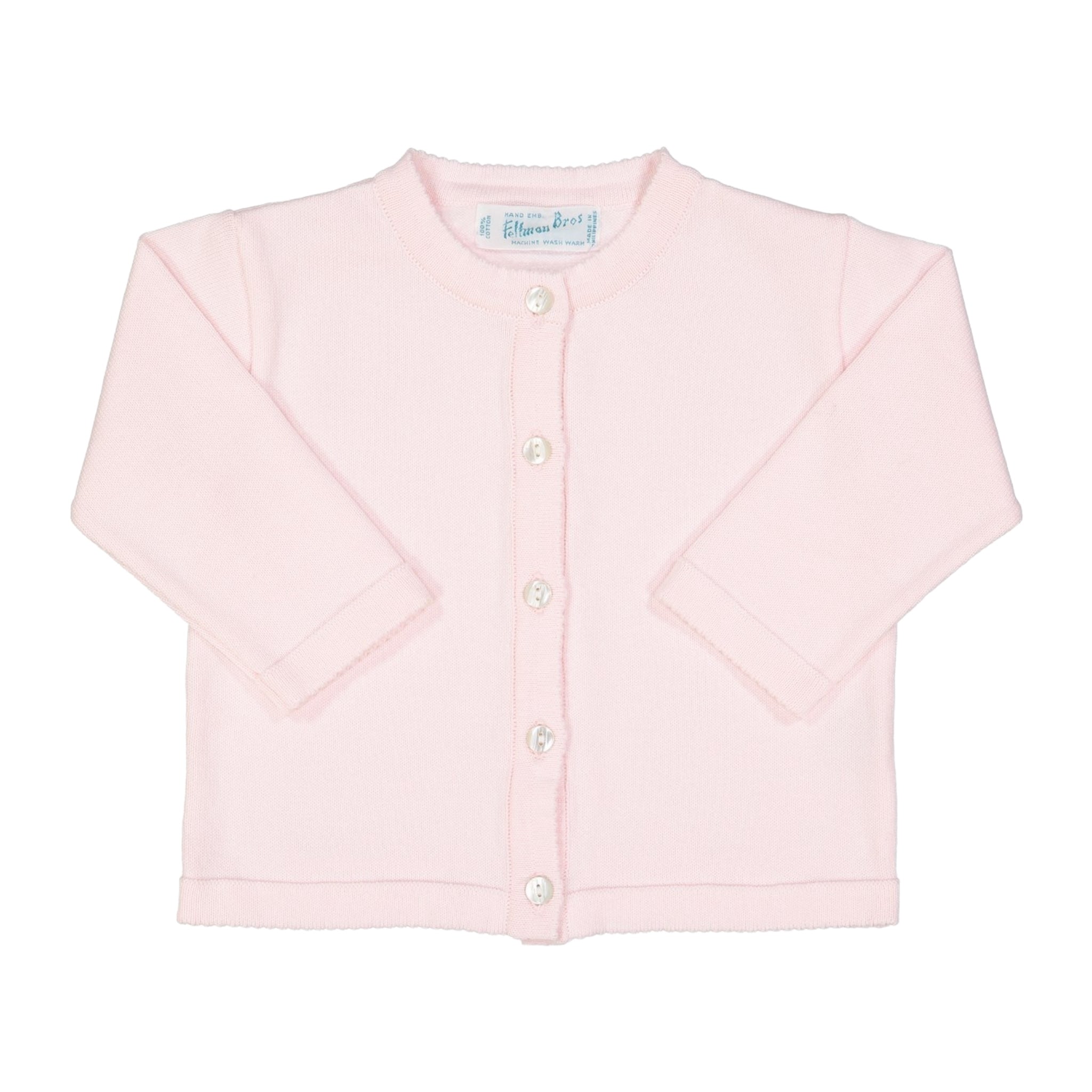A cardigan as versatile as it is classy! With its soft and warm knit, this cardigan will keep your little one warm and cozy all the time. The perfect piece for layering on top of holiday outfits, special occasion sets, or everyday layette. Crisp, cute, and oh so classy!