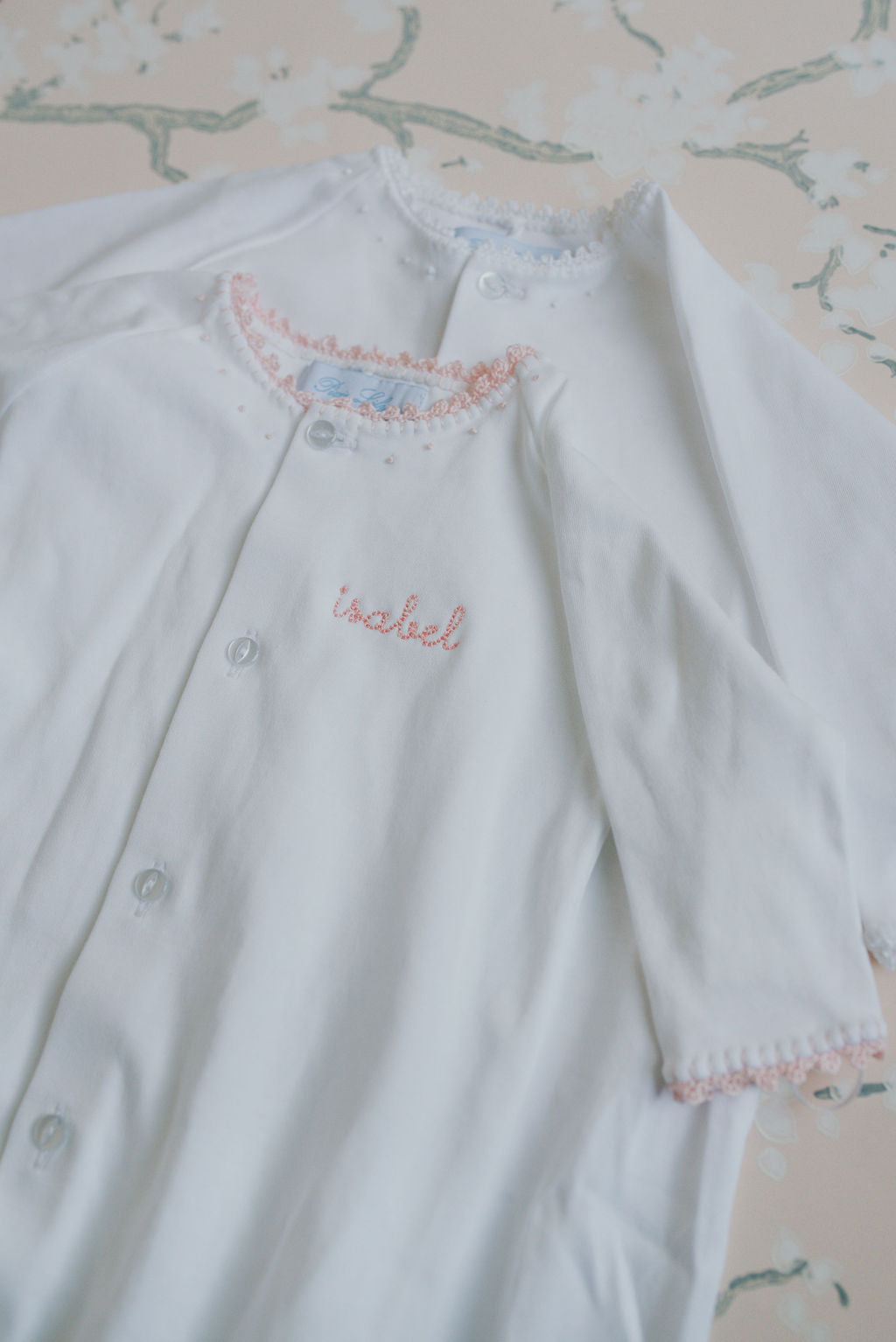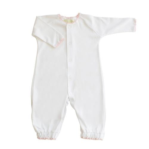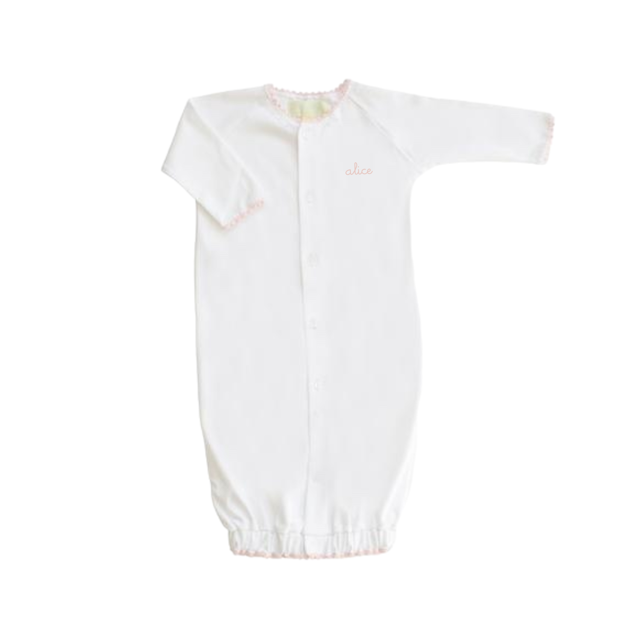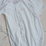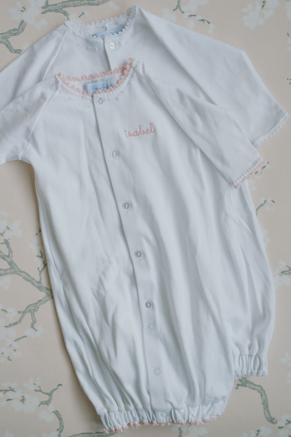 Converts from a gown to a romper with a few snaps. Also available with white trim and blue trim.