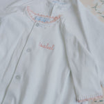A soft cotton gown trimmed with hand crochet and French knots with buttons down the front. Cozy enough for a day napping at home, yet formal enough for a baby's day out and about. This is a gift any new mother would be thrilled to receive.