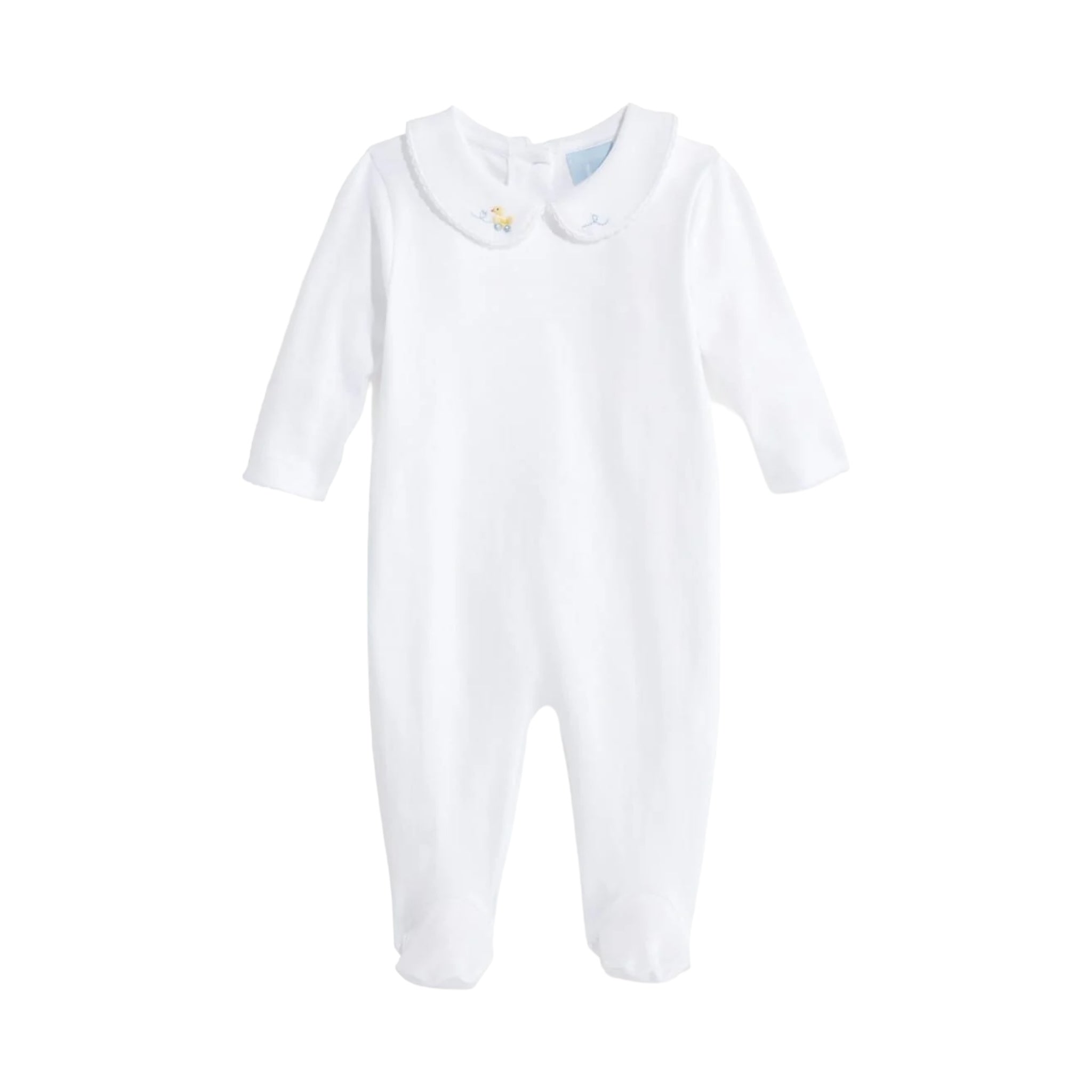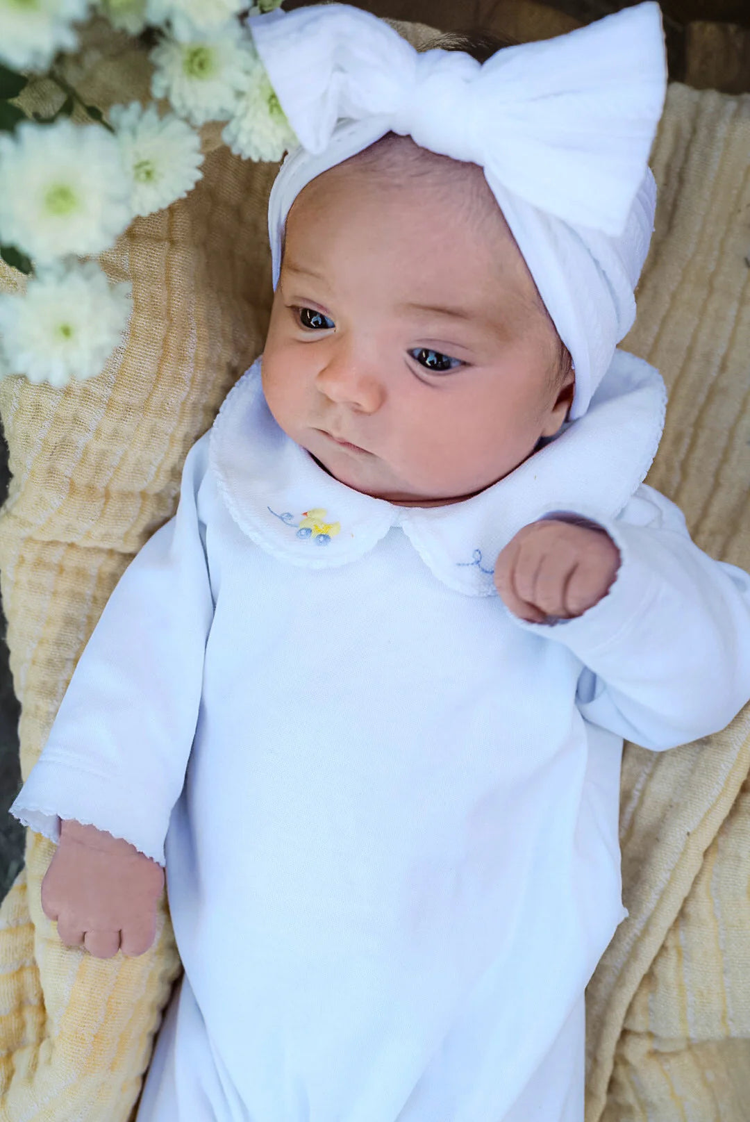 A Peter Pan collar and precious embroidery add distinction to our all-season favorite. Pair with our coordinating sweaters on chillier mornings. Button-back closure allows for easy diaper changes. 100% Pima cotton; machine wash. Sizes 3-12m. For best results, lay flat to dry then fluff on low heat. Please note, when ordering, this garment is not preshrunk. Potential shrink, upon laundering, is between 5-6 percent.