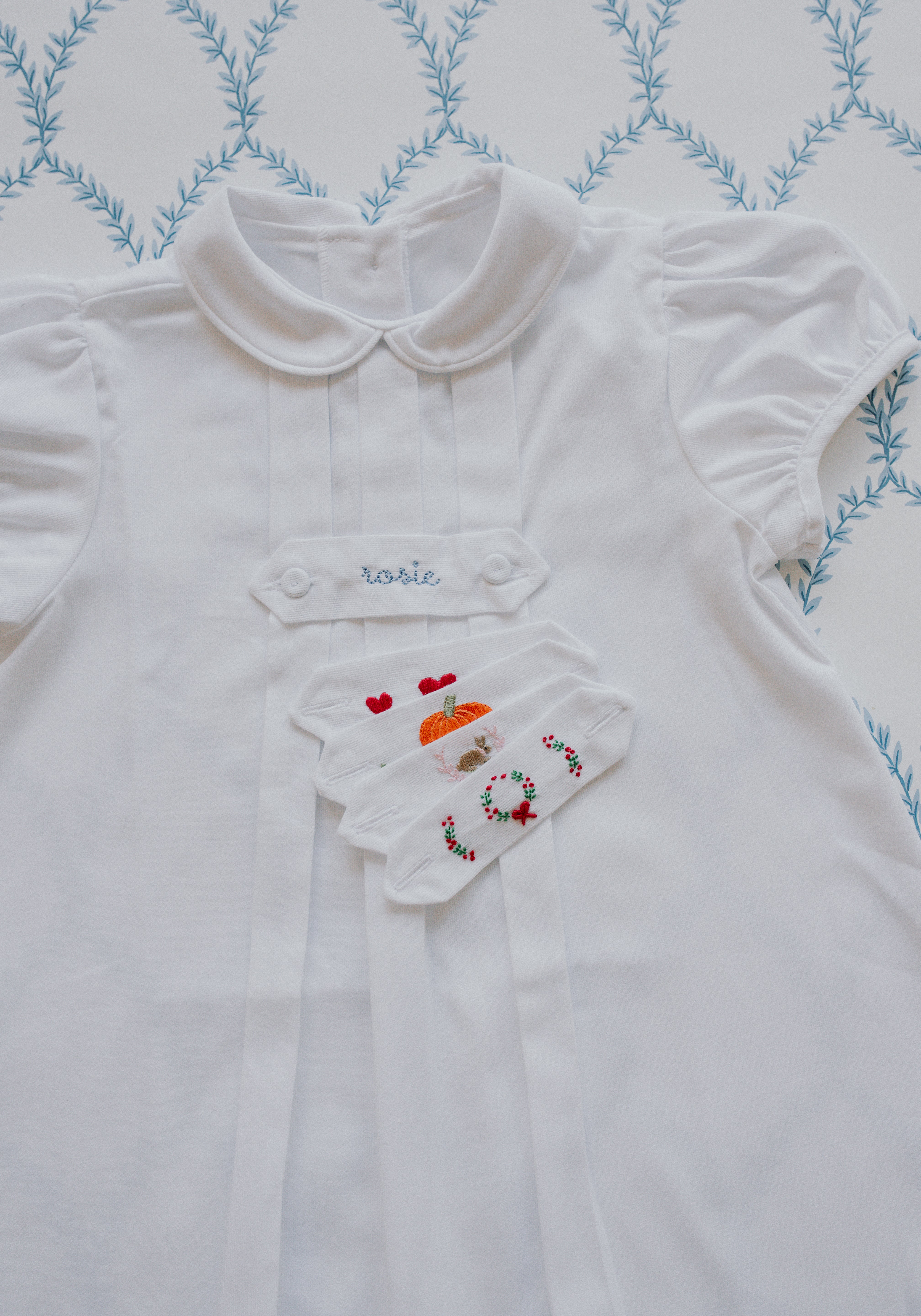 The Every Holiday Styles Are Cut In White Pique And Come With Tabs For Halloween/Thanksgiving, Christmas, Valentine's Day And Easter, Plus a blank tab with the option to have it personalized.