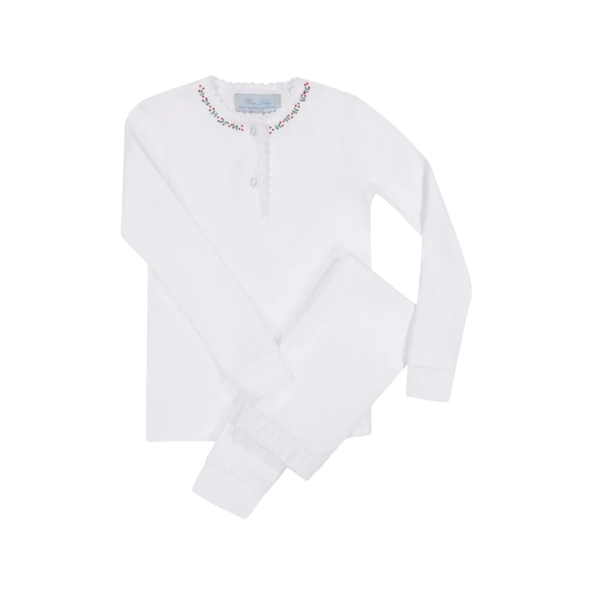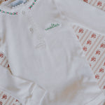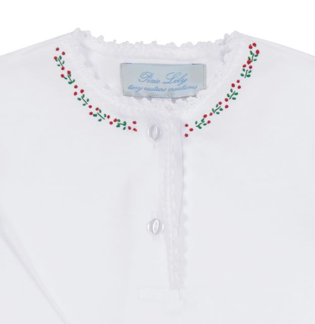 Pixie Lily Holly Pajamas Are Embroidered In Trimmed With Crochet Tatting. Personalized embroidery is placed on the top right chest.