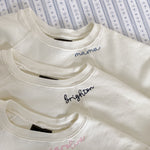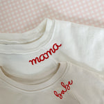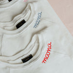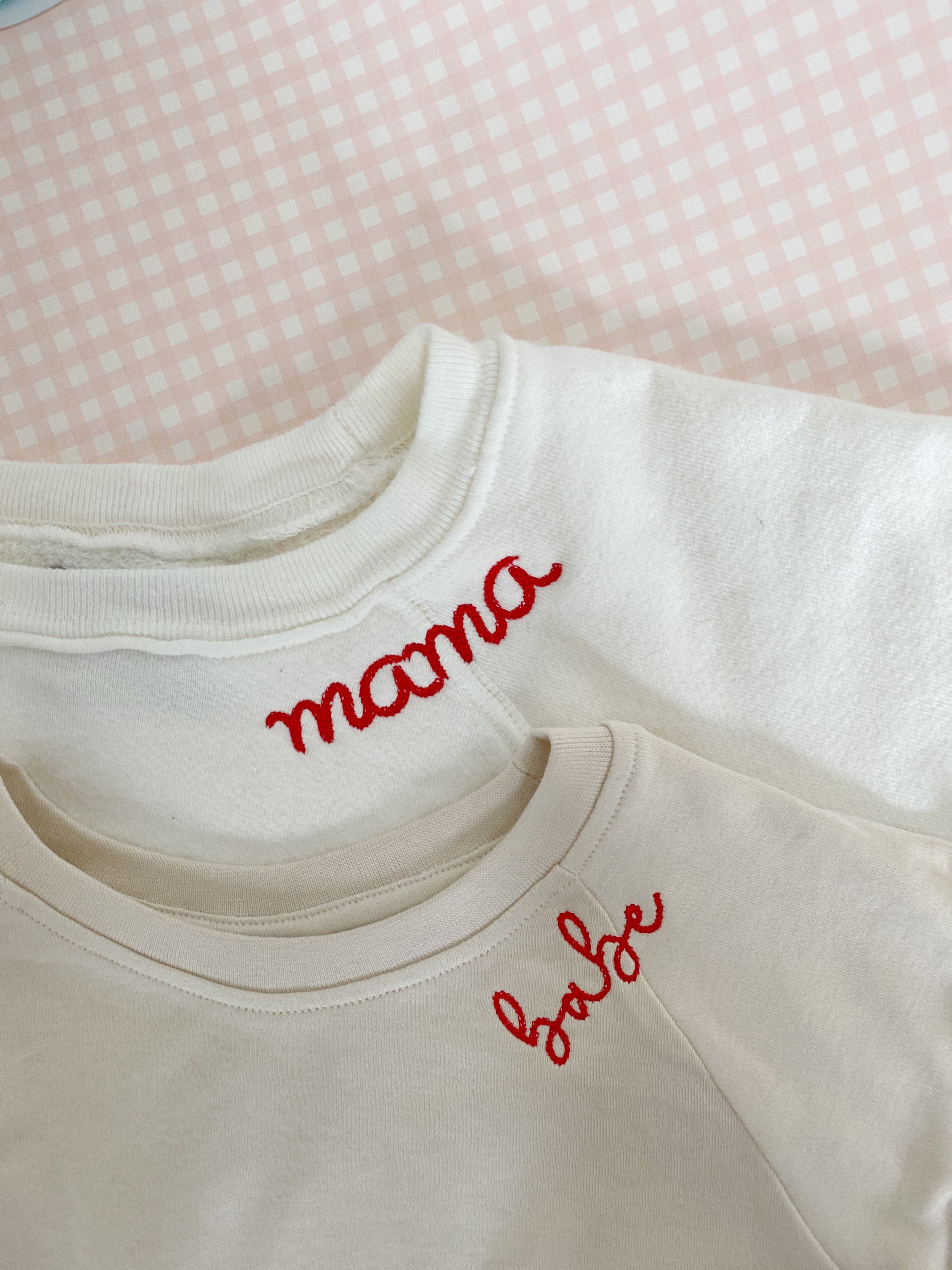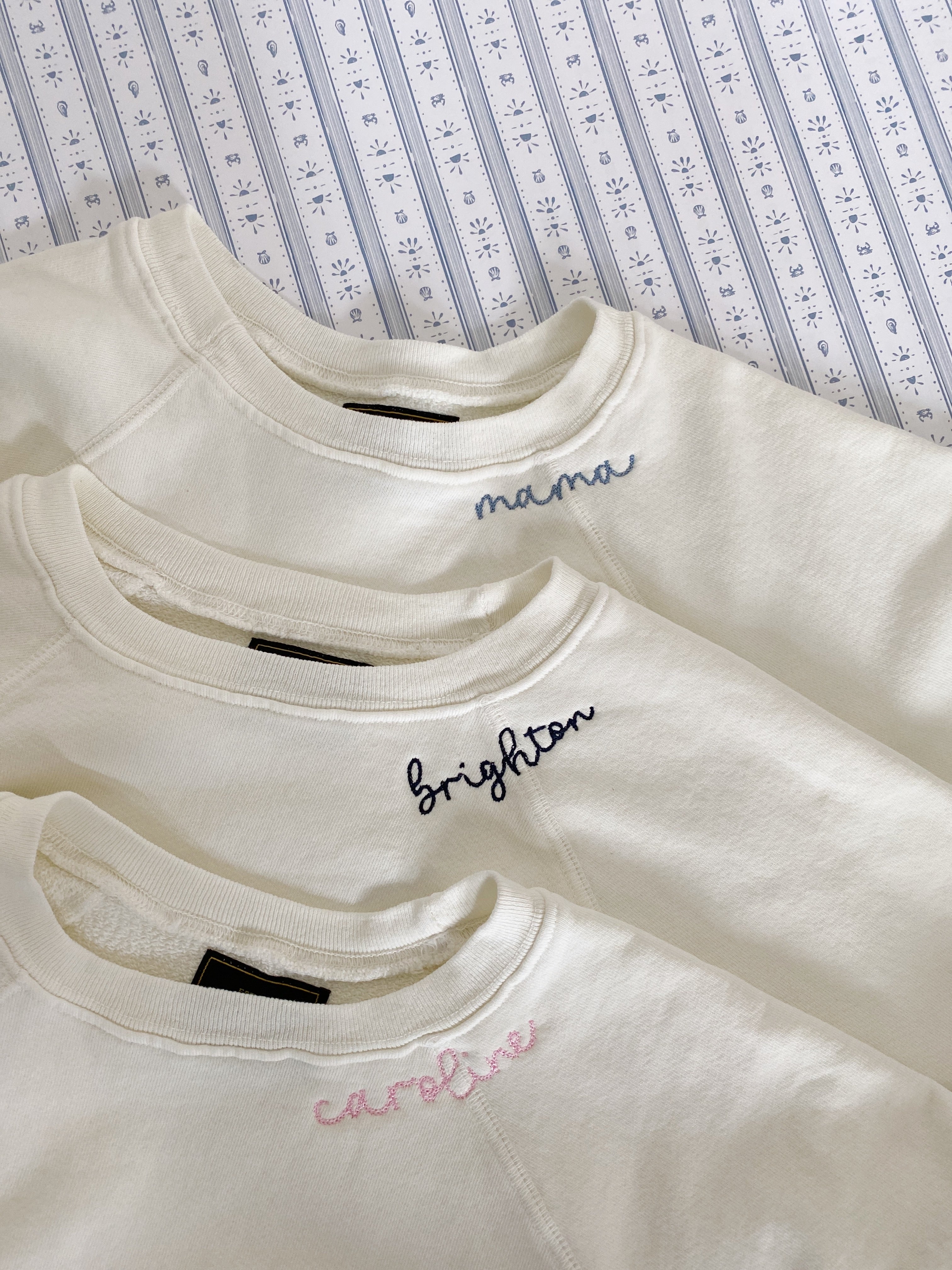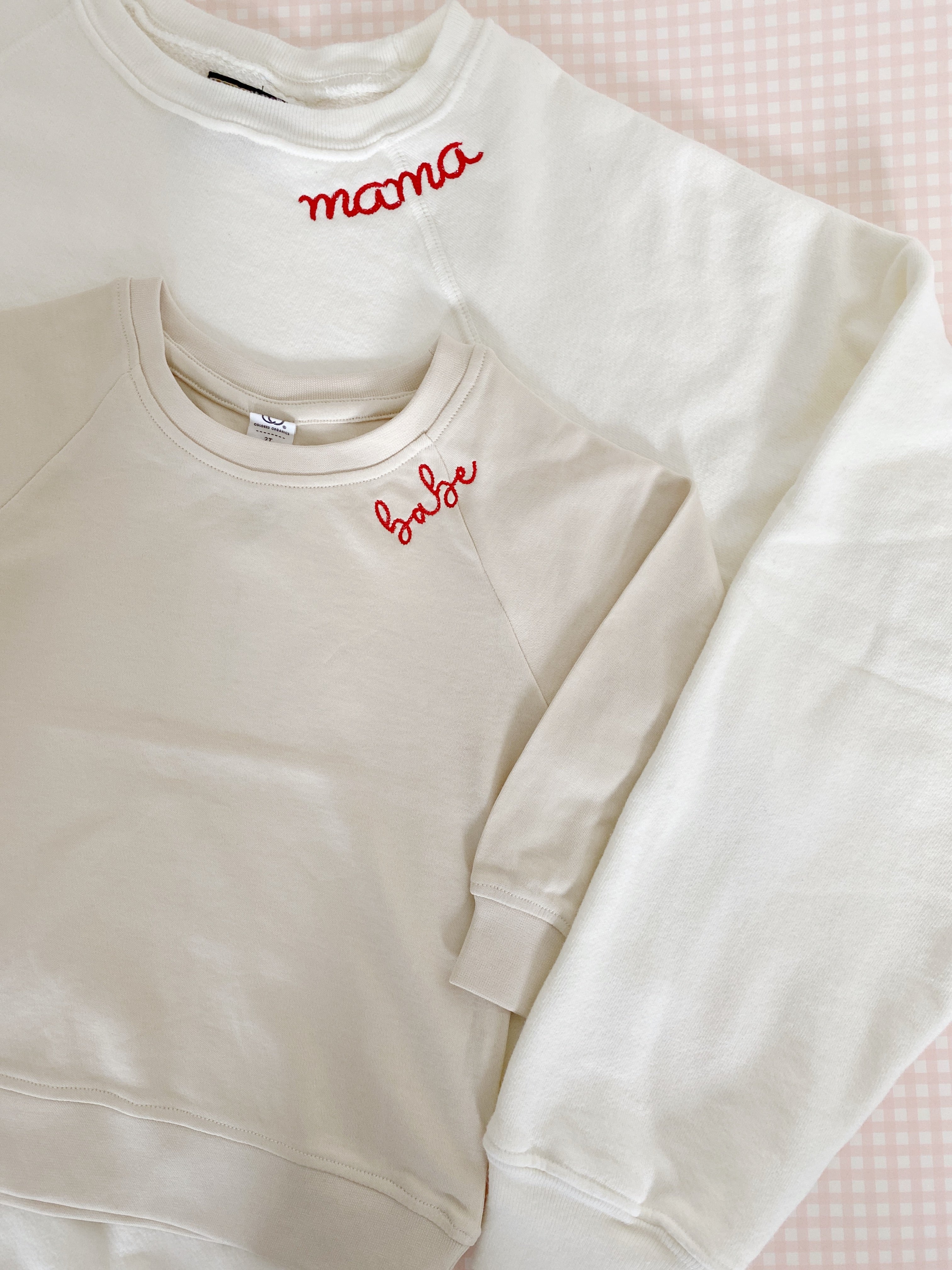Want to match your little one? We now offer a personalized pullover for all the little babes! Click here to order. This pullover is slightly lighter in color than the kid's pullover. Both still a light, natural color.