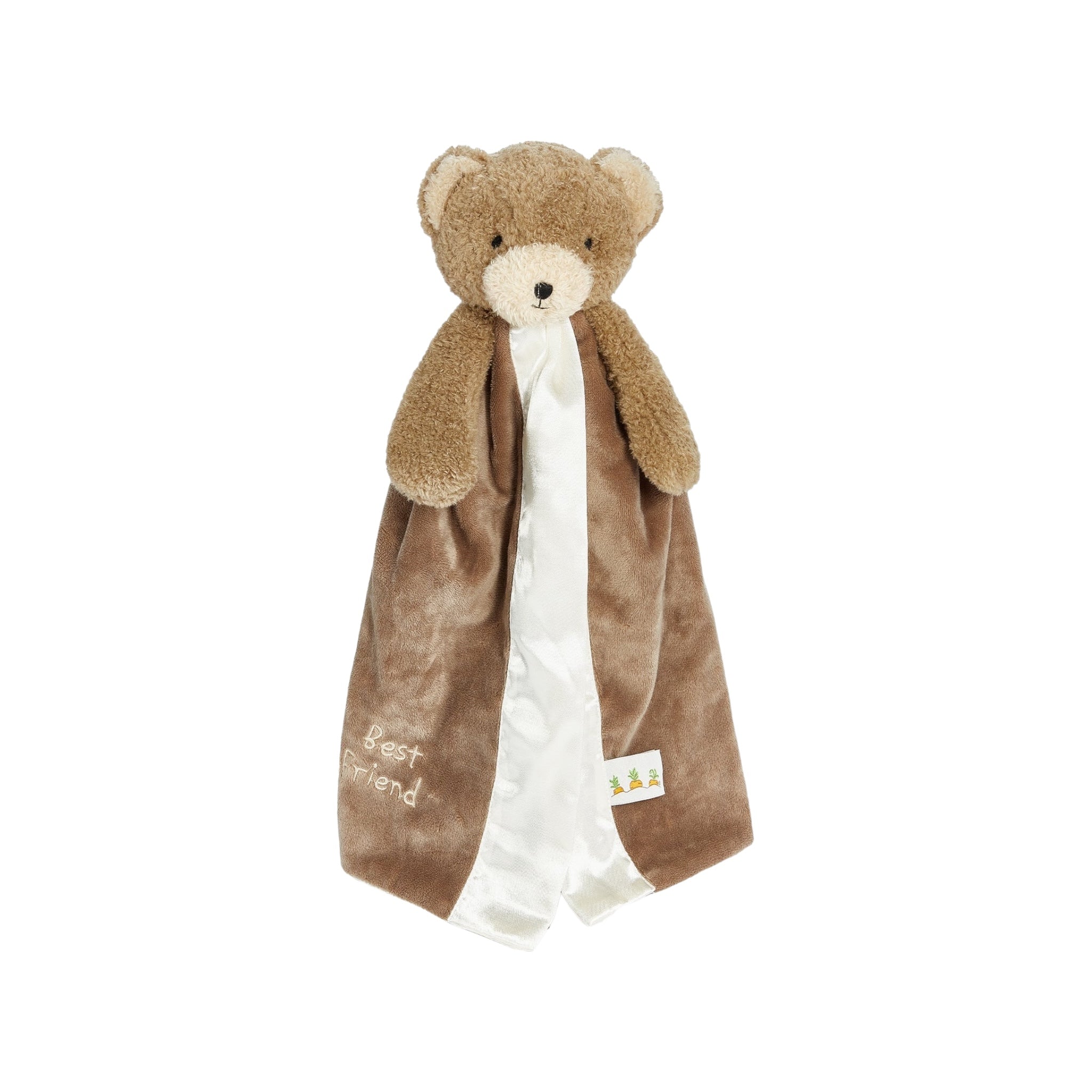 Cubby the bear is now a lovey for little ones to cherish. Rich mushroom brown velour split blanket with cream satin trim lining and fuzzy fur head to match. Sure to become a best friend for your little one, the difference is in the details. From the embroidered message along the edge of the blanket that reads, “Best Friend Cubby” to the signature three carrot tag that every baby will undoubtedly explore with their little fingers, our security blankets are a must-have comfort for baby.
