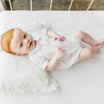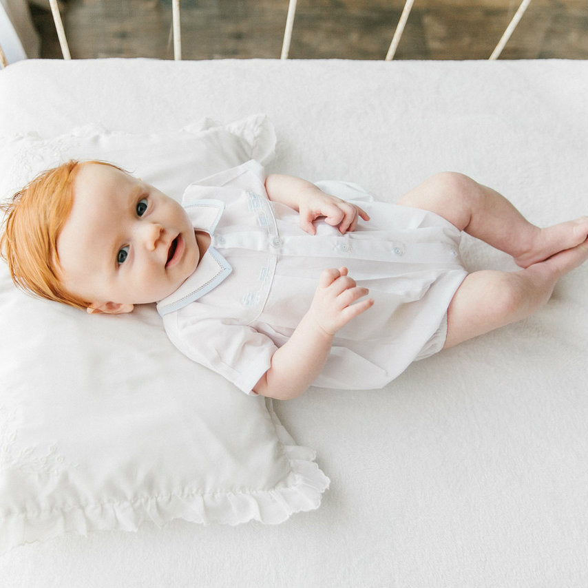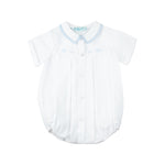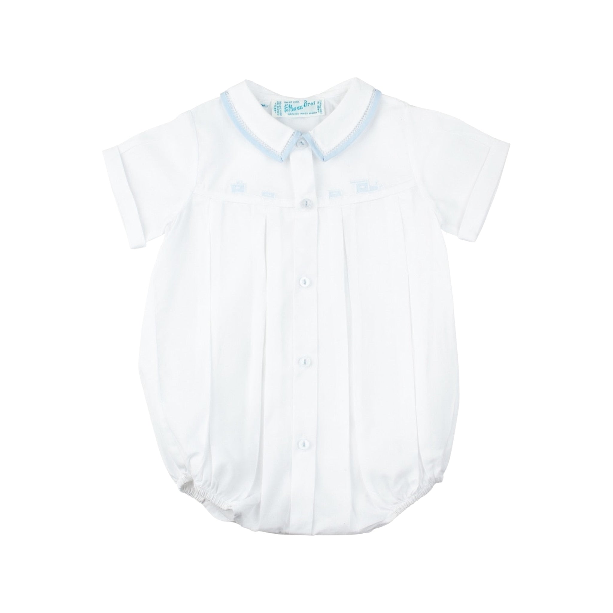 A cute and classy creeper for your little one, made with the attention to detail. This baby boy outfit is available in white and blue with contrasting colored details. A sweet little collar is lined with delicate fagoting and contrasting borders. An adorable embroidered train graces the front for a look that is unique and oh so cute. Your loved will look as sweet as can be in his classy new creeper!