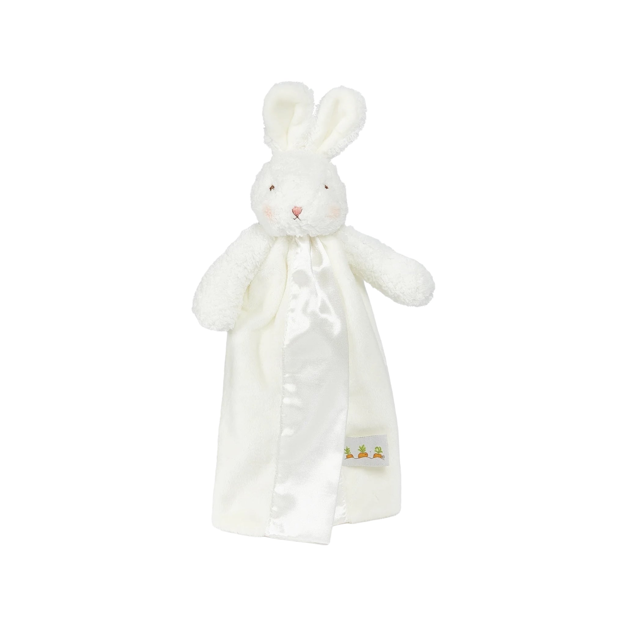 This favorite security blanket is a plush floppy eared bunny with handcrafted, baby-safe embroidered face and a snuggly soft white velour split blanket, lined and edged in silky satin. Signature three carrot tag for little one's fingers.